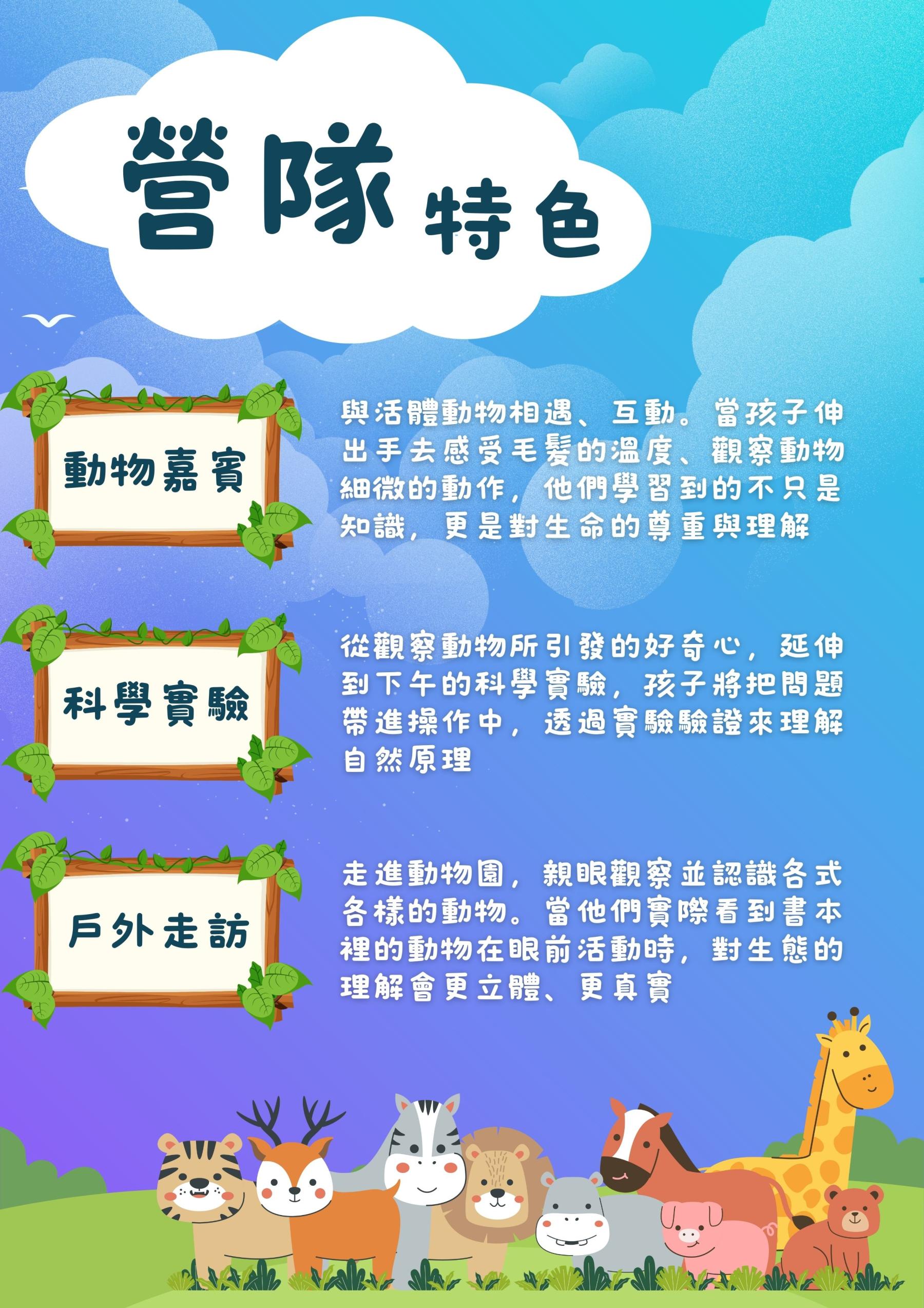 這是一場結合自然觀察與遊戲化任務的冒險旅程。五天的課程中,孩子將化身小小訓練家,帶著探索的眼睛與好奇的心,展開一段專屬於自己的探索之路。孩子將透過主題引導與實際與動物接觸,學習如何發現並記錄身邊的生命特徵。透過趣味豐富的活動與實驗,讓孩子在動手嘗試的過程中,體會科學的奧秘,並把所見所學自然地連結到日常生活。 此外,營隊特別安排動物園探訪,讓孩子走進真實世界的「自然場景」,近距離觀察動物的行為與生態,進一步理解不同生命在自然中的角色與價值。