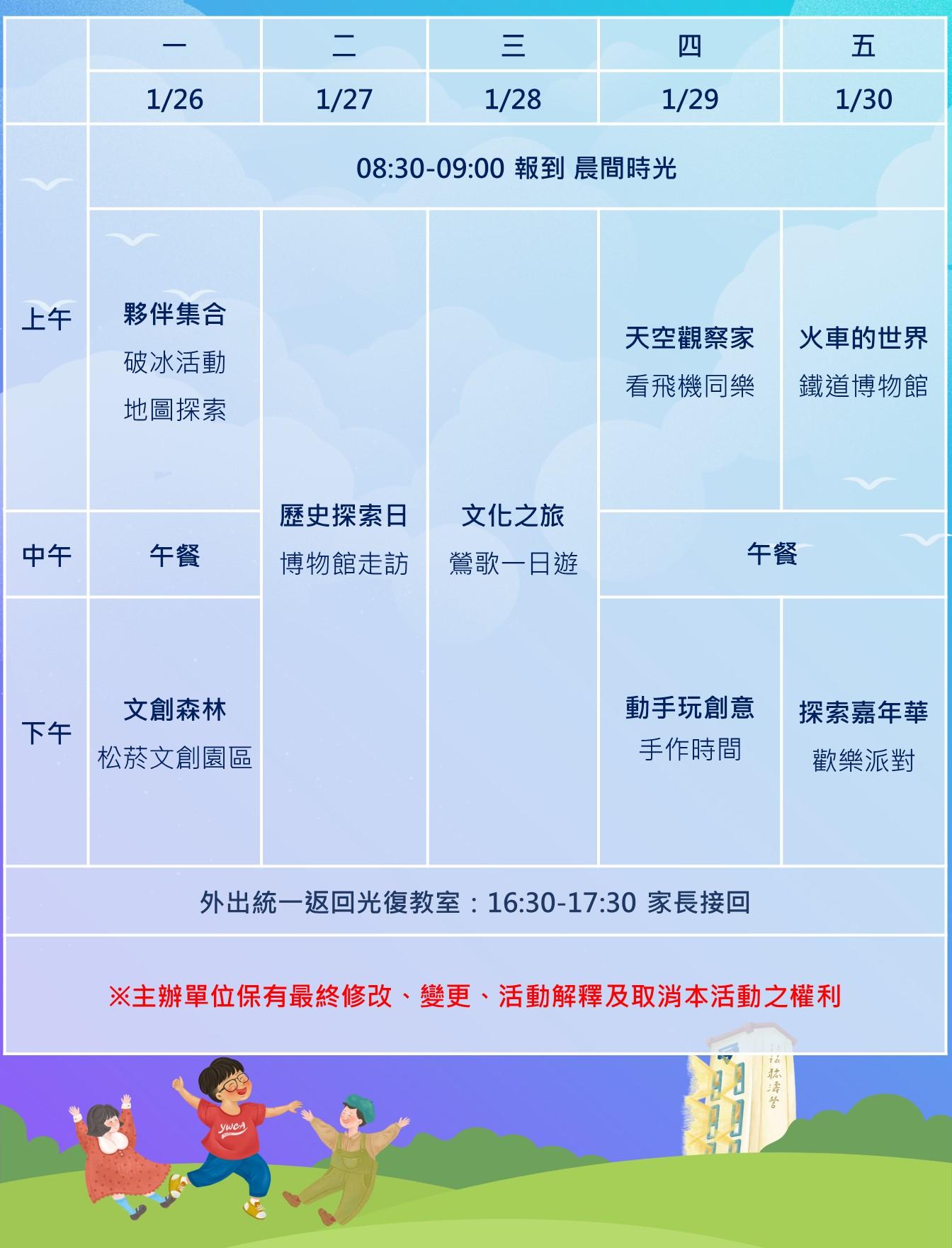 (活動期間實際活動內容與順序,會因天氣狀況、其他不可抗力之因素,以及學生學習效益等,本會將保留活動調整權利。)