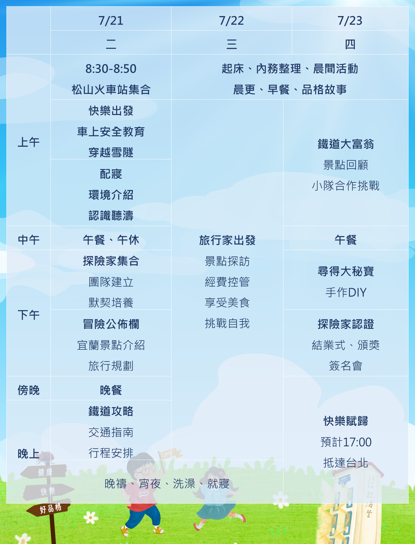 (活動期間實際活動內容與順序,會因天氣狀況、其他不可抗力之因素,以及學生學習效益等,本會將保留活動調整權利。)